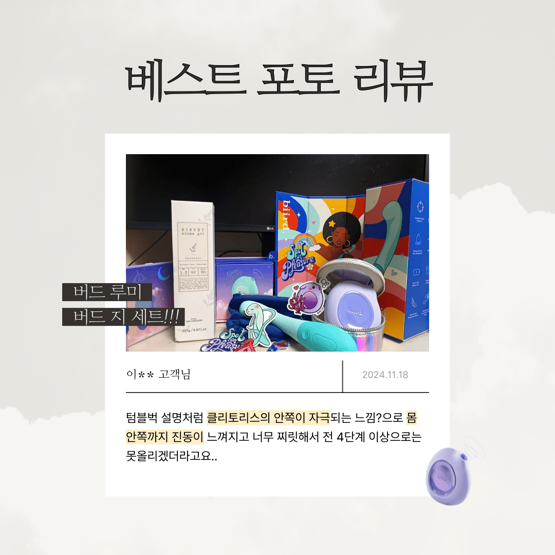 텀블벅 설명처럼 클리토리스의 안쪽이 자극되는 느낌?으로 몸 안쪽까지 진동이 느껴지고 너무 찌릿해서 전 4단계 이상으로는 못올리겠더라고요..